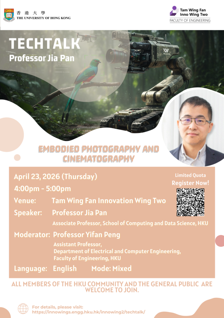 • The tech talk “Embodied Photography and Cinematography” will be organized in the Tam Wing Fan Innovation Wing Two (G/F, Run Run Shaw Building, HKU) on 23rd April 2026 (Thursday), 4:00pm.